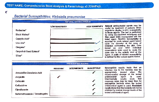 His stool comprehensive results showed dysbiotic flora i.e. 4+ Campylobacter spp. and 4+ Klebsiella pneumonia that have the potential to cause disease in the GI tract. They can be present due to exposure to toxins/chemicals, excessive use of antibiotics, poor diet etc.