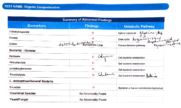 His organix tests revealed abnormal high level of biomarkers including suberate, L-lactate, citrate, succinate, a-ketaglutarte and many other. (Pic 4)