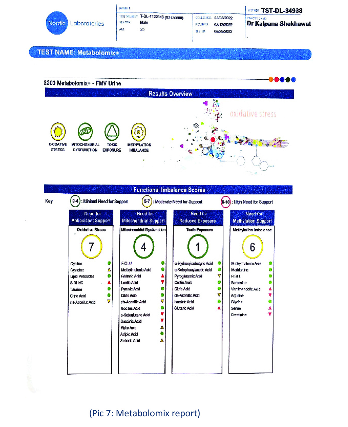 Metabolomix report (Pic 7) revealed high oxidative stress, methylation imbalances, multiple amino acid deficiencies, low levels of glutathione, very low levels of vitamin C, critically low level of riboflavin, magnesium, zinc, niacin etc.
